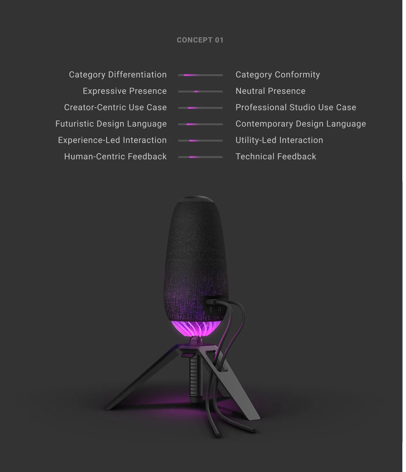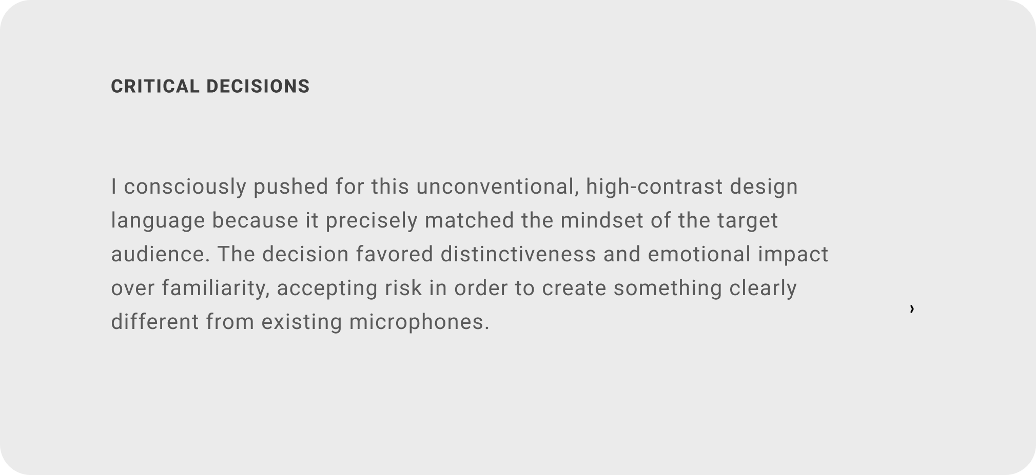 During my agency time, we initiated an internal team project to explore a microphone designed specifically for the digital creator era. Driven by the rise of gaming and streaming, the project combined research, product design, branding, and UX/UI into a single, speculative product vision.