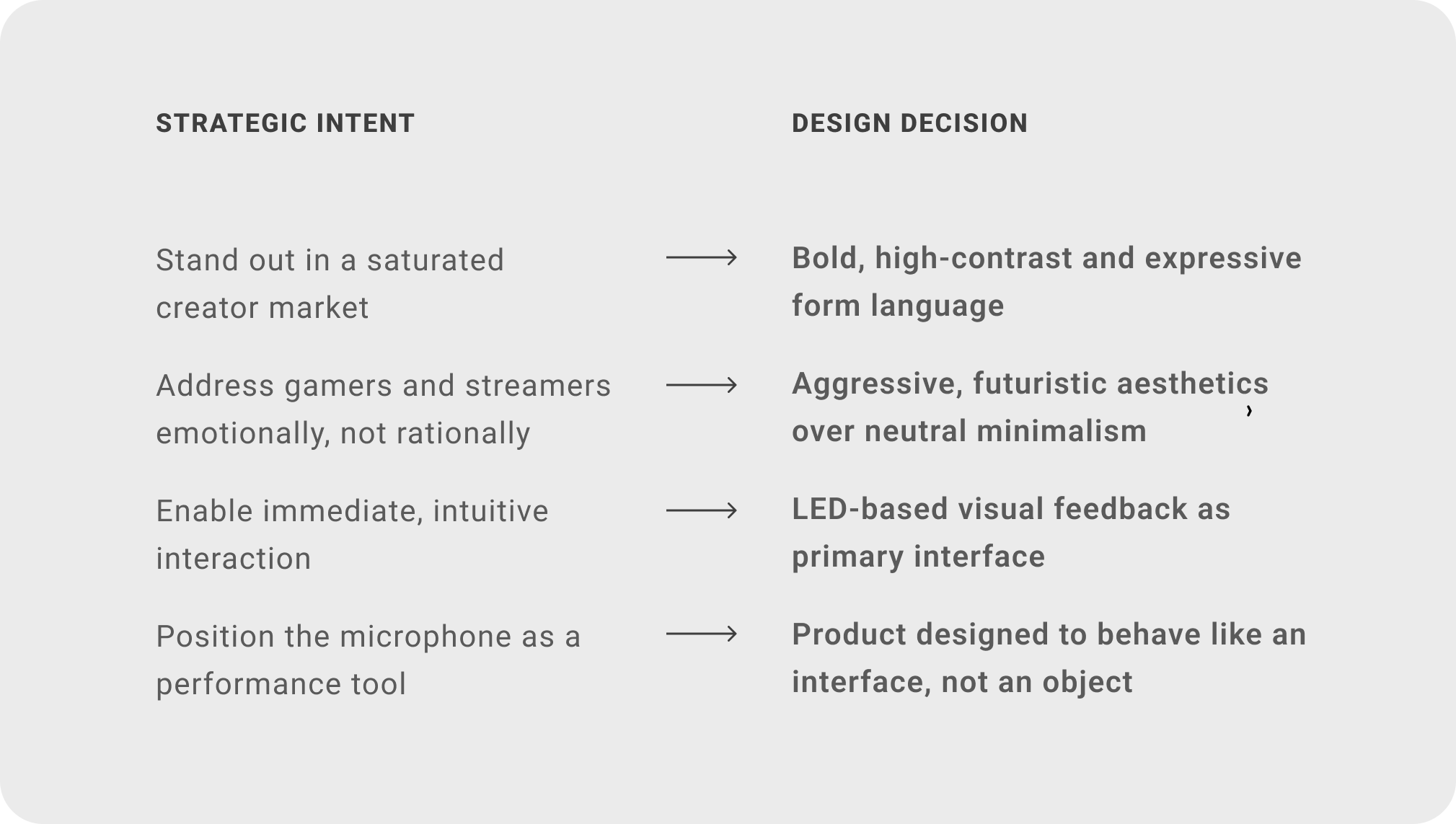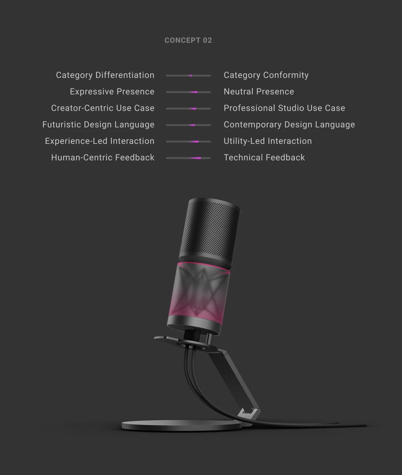 The microphone was designed to feel bold, technical, and unapologetically futuristic—closer to a digital interface than a traditional audio device. Rather than blending into the environment, it was meant to signal performance, control, and presence, clearly targeting gamers and streamers who expect expressive hardware.
