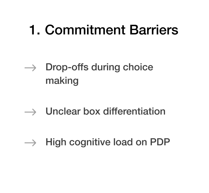 Subscription conversion was constrained by decision uncertainty during product discovery. Users struggled to differentiate box types and configuration options, causing hesitation at the commitment point. Drop off while discovering the PLP and PDP ranged between 60-80%.