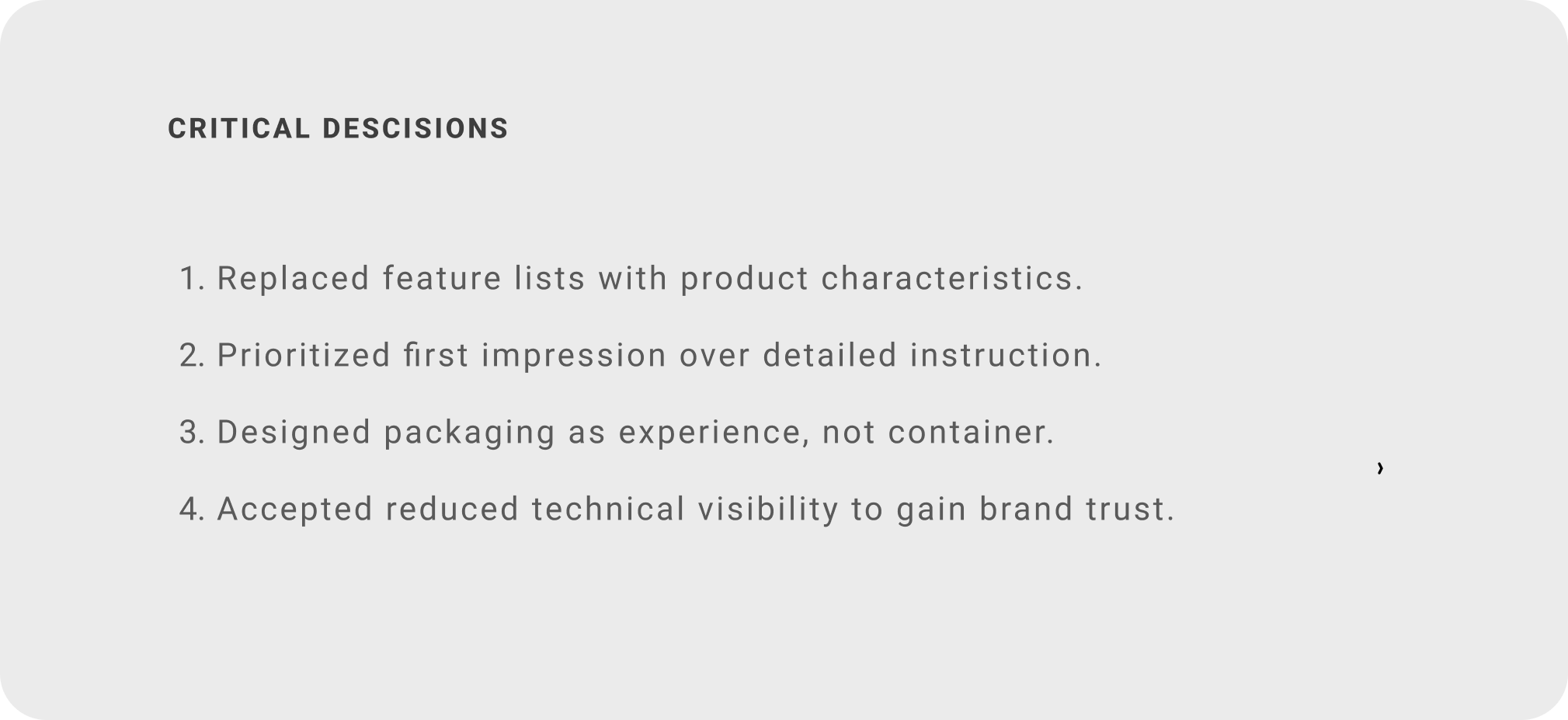 The unboxing experience was designed as the first physical touchpoint with the product, making it essential to deliver clarity, confidence, and perceived quality immediately. Information architecture was carefully sequenced to guide users step by step without friction.