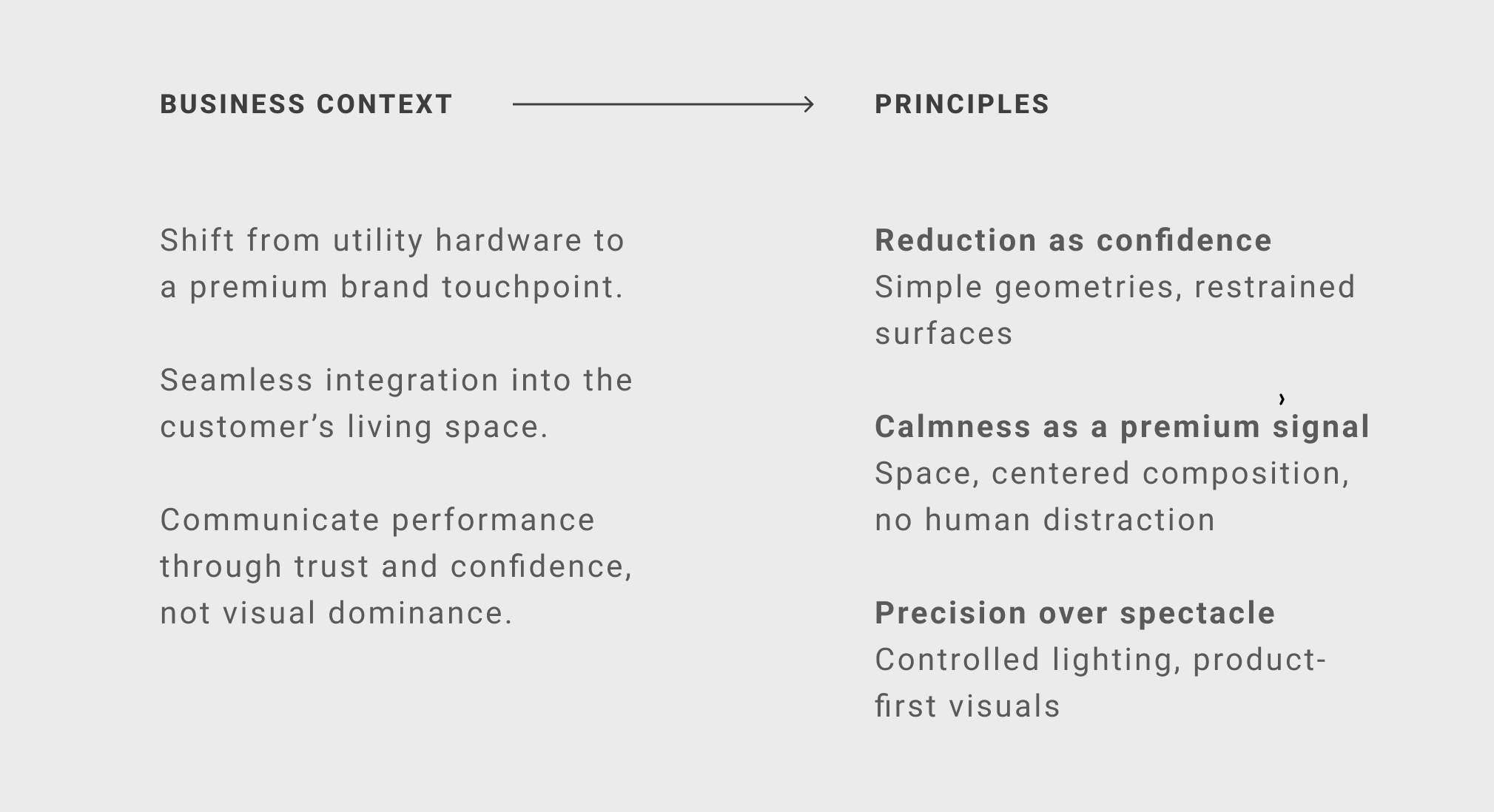 The project deliberately rejected typical tech-driven design signals. Instead, it reframed performance as something felt rather than explained, using reduction, spatial integration and controlled visual storytelling to position the device as a permanent, premium brand presence within the home.